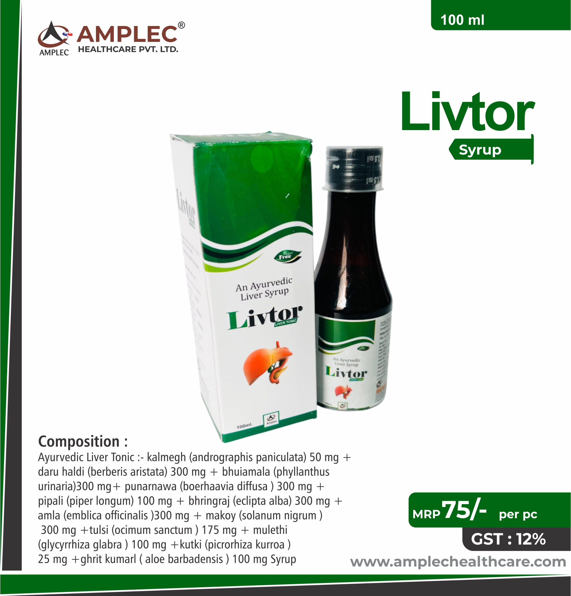 Ayurvedic Liver Tonic :- kalmegh (andrographis paniculata) 50 mg +daru haldi (berberis aristata) 300 mg + bhuiamala (phyllanthus urinaria)300 mg+ punarnawa (boerhaavia diffusa ) 300 mg + pipali (piper longum) 100 mg + bhringraj (eclipta alba) 300 mg + amla (emblica officinalis )300 mg + makoy (solanum nigrum ) 300 mg +tulsi (ocimum sanctum ) 175 mg + mulethi (glycyrrhiza glabra ) 100 mg +kutki (picrorhiza kurroa ) 25 mg +ghrit kumarl ( aloe barbadensis ) 100 mg Syrup