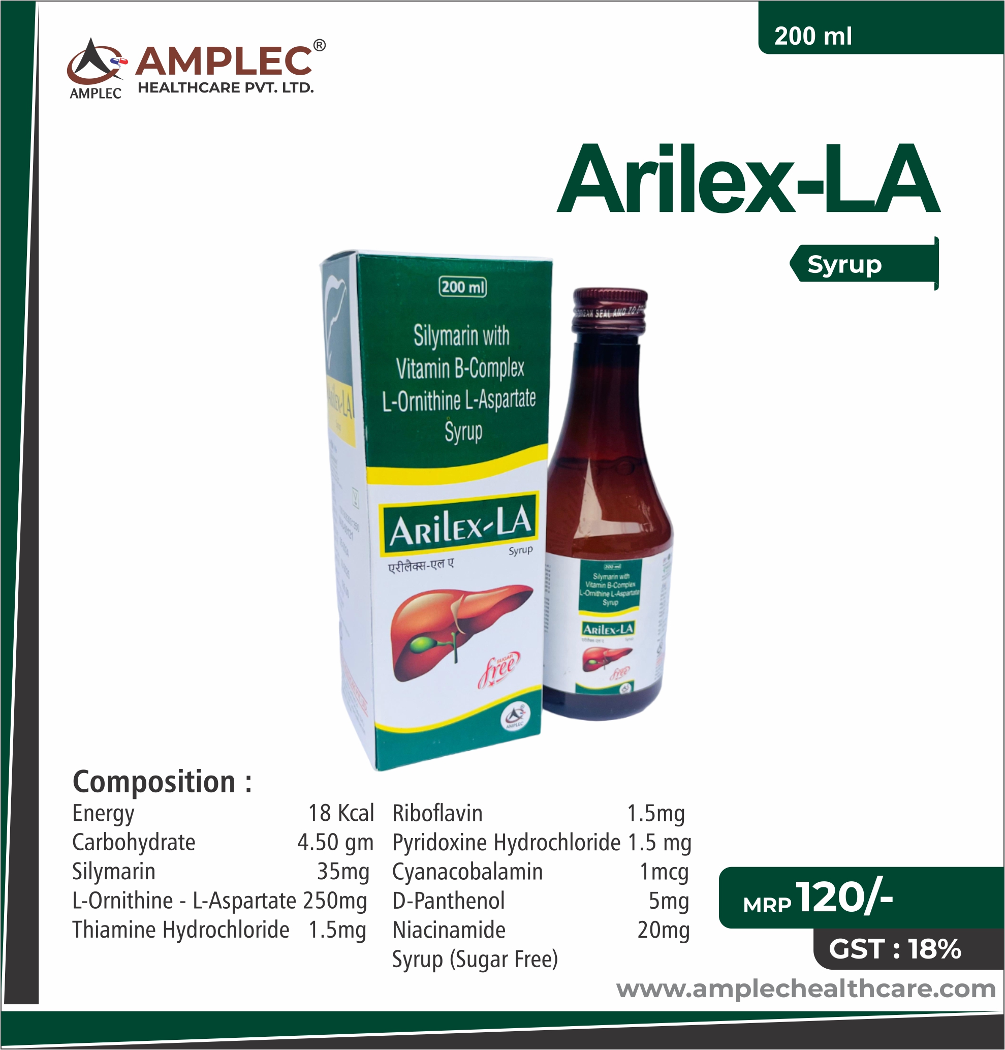 Energy 18 Kcal + Carbohydrate 4.50 gm + Silymarin 35mg + L-Ornithine - L-Aspartate 250mg Thiamine Hydrochloride 1.5mg + Riboflavin 1.5mg + Pyridoxine Hydrochloride 1.5 mg + Cyanacobalamin 1mcg + D-Panthenol 5mg + Niacinamide 20mg Syrup (Sugar Free)